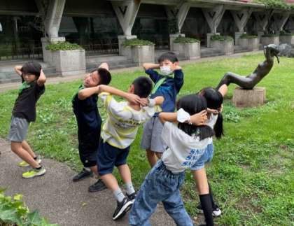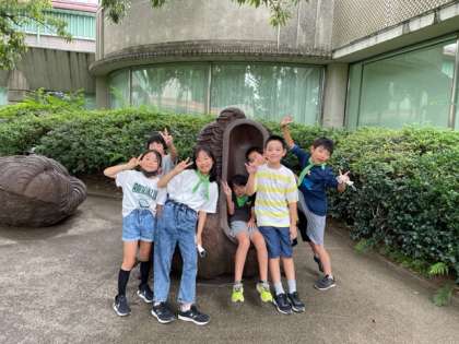 美術館外の展示物の見学です。外は風が心地よくて気持ちがいいです。作品と同じようなポーズをしています。三葉虫で記念写真を撮りました。