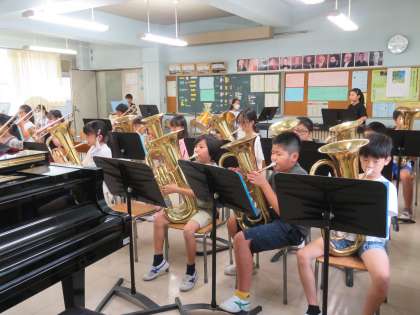 金管バンドは毎日休みなしで活動しています。音楽室に入ると、いつも気持ちのいいあいさつがあり、朝から清々しい気持ちになります。現在は、新たな曲にチャレンジしています。