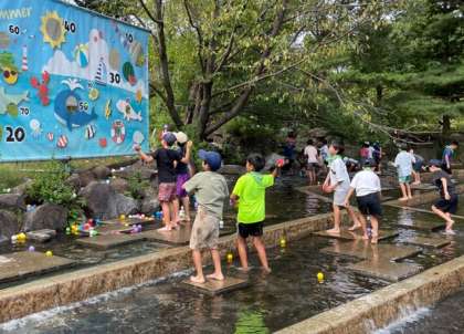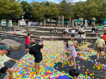 食べ終わったグループは「水遊びの池」で遊びました。「水遊びの池」は大人気です。ボールを投げ合ったり的当てをしたりして大喜びです!