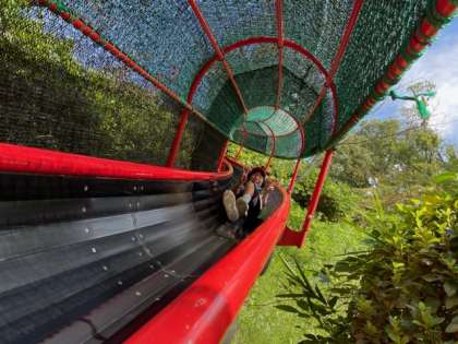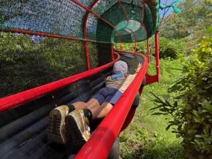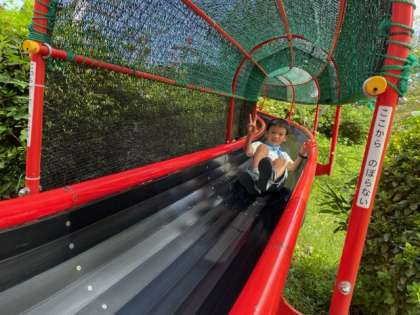 クラスごとに遊んでいます。写真は白鳥湖近くの長いすべり台の様子です。