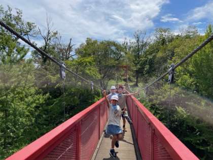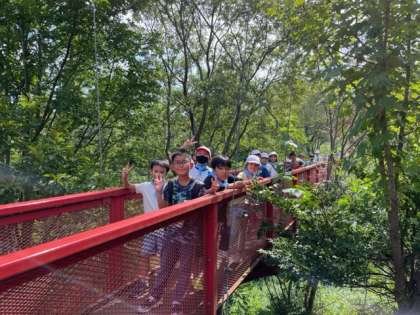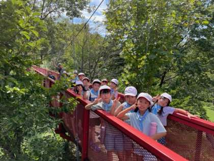つり橋を渡って遊んでいます。ゆらゆらゆれて、ちょっとこわいけれど楽しんでいます!