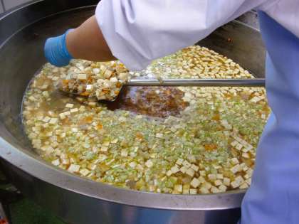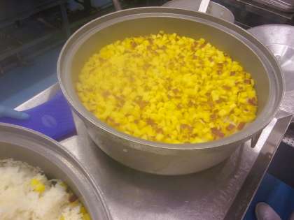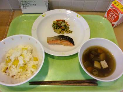 さつまいもは、ゆっくり加熱することで甘くなるので、今日はごはんと一緒に炊いたさつまいもごはんです。