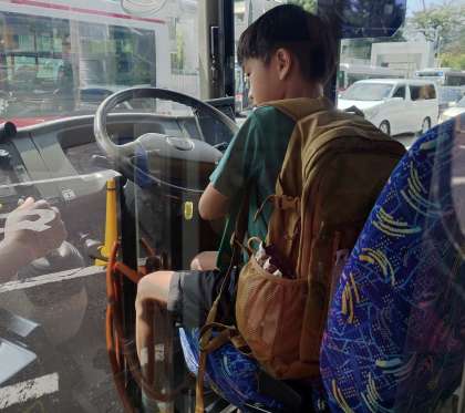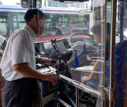弦巻営業所では、バスの運転座席にも座らせていただくことができました。このような貴重な体験学習ができたごとに心より感謝申し上げます。