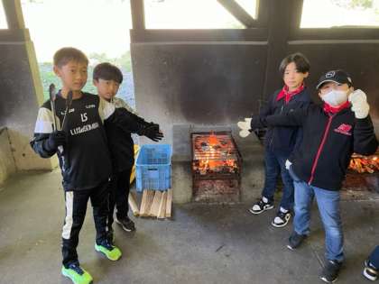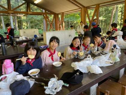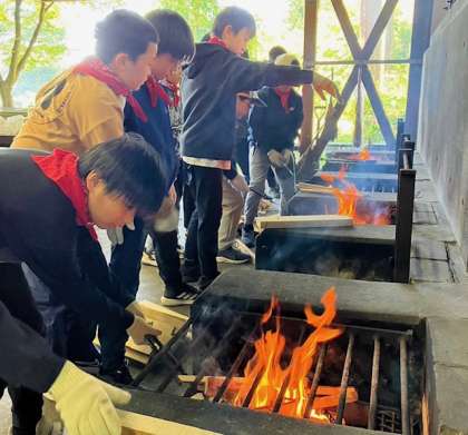 薪に火がついたら網の上にリンゴを乗せて焼きます。7〜8分待つと甘みが全体にいきわたります!