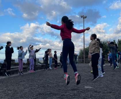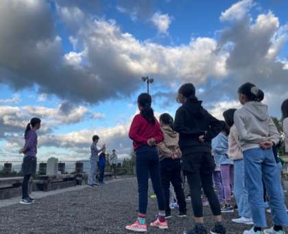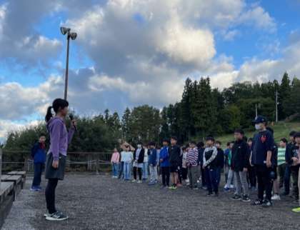おはようございます。今日の天気は晴れのち曇り、最高気温27度です。まずは朝会、体操としてボンファイヤーダンスを踊りました。