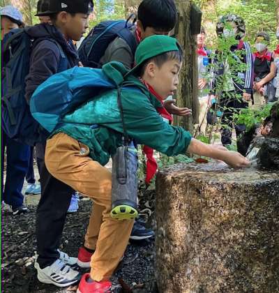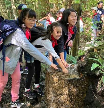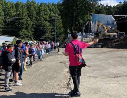 村めぐりは、担任の先生や子どもたちの説明を聞きながら、クラス毎にまわっています。途中のコンニャク畑、シイタケ栽培、稲穂、湧き水などを見学をしました。