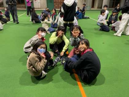 実はキャンプファイヤーは、雨雲レーダーと睨めっこでした。小雨が降っていたのでスタートを10分遅らせました。そして30分間、雨雲の切れ目がありましたので、火の儀式、歌、ダンスなどを行うことができました。30分後に大雨を降らせる雨雲が接近して来ましたので「猛獣狩りにいこう」からは屋根付き広場で楽しみました。