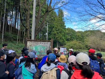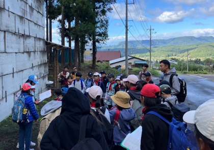 村めぐりは、担任の先生や子どもたちの説明を聞きながら、クラス毎にまわっています。途中のコンニャク畑、シイタケ栽培、稲穂、湧き水などを見学をします。