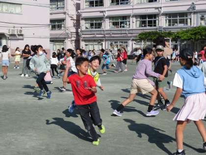 先生も一緒に鬼ごっこで遊んでくれています。集会委員会の皆さんのお陰で朝がら楽しい時間を過ごすことができました。ありがとうございました!