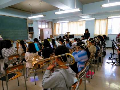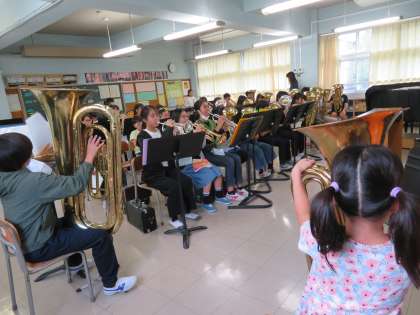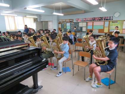 金管バンドのスタートは、日々、音階ロングトーンからはじめています。先輩のお手本を聴きながら全員でロングトーンの練習をしています。プロ奏者は、その日の練習開始のウォーミングアップを必ずロングトーンからはじめます。一つの音を出来るだけ長く吹き伸ばすことですが、これがどうしてなかなか奥が深いのです。