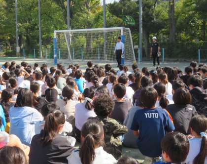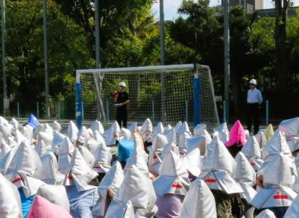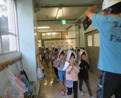 今日の避難訓練は、授業中に家庭科室から出火があり、校舎全体に燃え広がる危険があるため、校庭から第二次避難場所である「どんぐり山公園」へ避難するという設定で行いました。子どもたちは「お・か・し・も・ち」の約束を守り一人ひとりが真剣です。