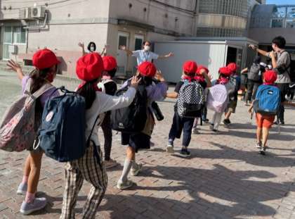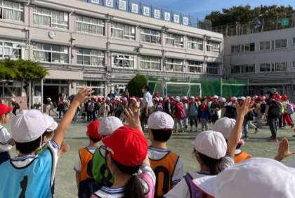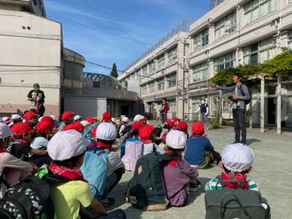 今日は1年生の遠足で砧公園です。1年生には、絶好の遠足日和のプレゼントが待っていました。出発式の様子も立派でした。