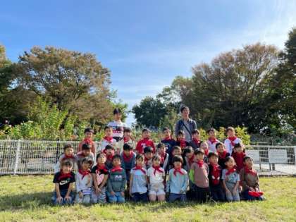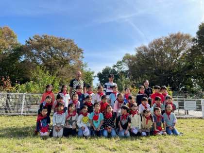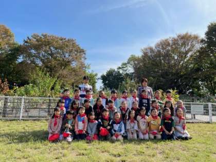 1年生は、砧公園までの長い道のりを元気よくがんばって歩きました。まずは、クラス毎に集合写真を撮りました。