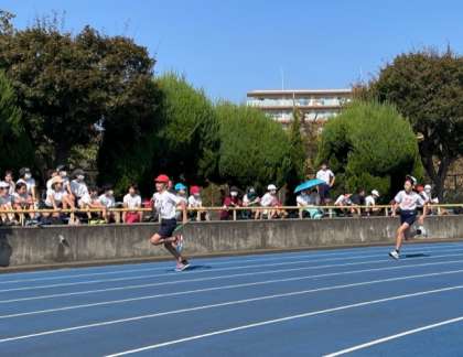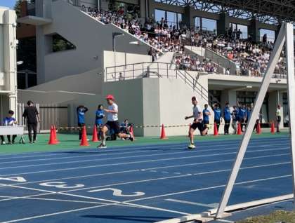 新種目である男女混合リレーの様子です。第6レーン、ピンクのナンバーカードが松丘小学校です。心を一つに、集中力の詰まったリレーに胸が熱くなりました。上位に入賞しました。