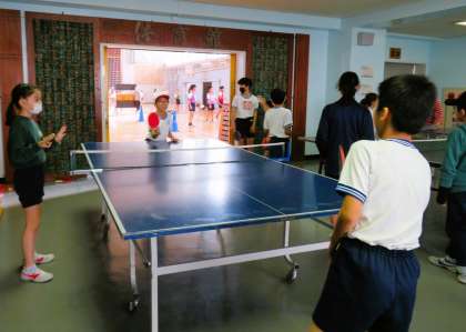 写真は、卓球、乗り物、生き物クラブの様子です。