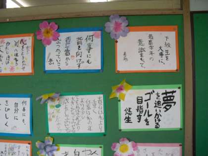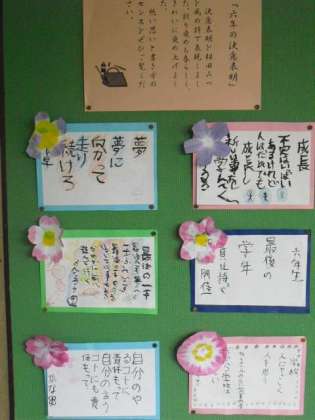 6年生の掲示物は、決意表明。利き手封じの手法で、自分の決意を短い言葉で書いています。一人一人の思いも伝わりますし、なるほどと納得する言葉が多くあります。この言葉をすべてまとめて本にしたら、結構元気がでるのでは・・などと思いました。