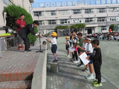 最後に、第2回室内遊びチャンピオンシップ『かぼちゃ杯』の表彰を行いました。「こまの部」「けん玉の部」「リズム遊びの部」の優勝です。