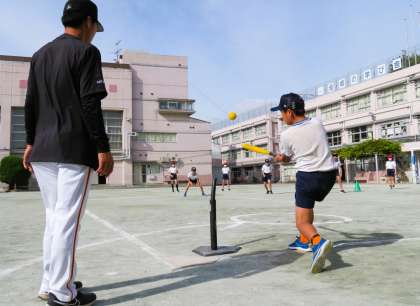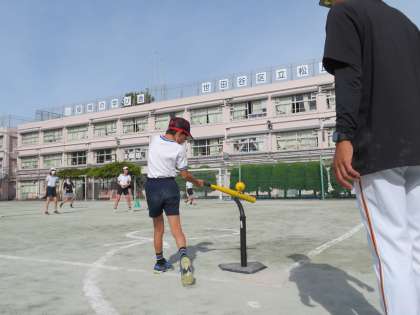 ティーボールに必要な「投げる・捕る・走る・打つ」という基礎的な動作を中心に行い、充実した1時間になりました。最後に子どもたちは、記念の帽子をいただきました。ジャイアンツアカデミーの皆さん、ありがとうございました。
