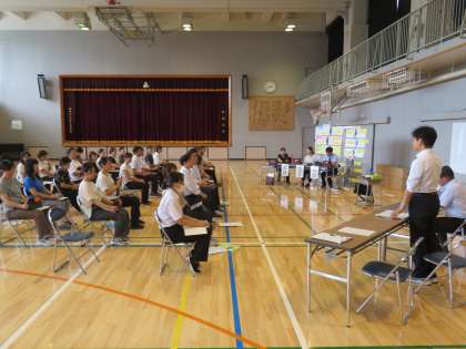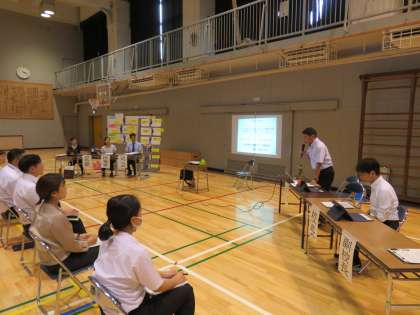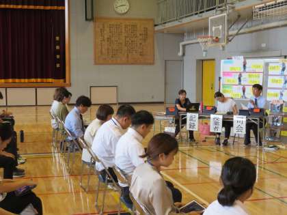 子どもたちの下校後は、実践した授業をもとに協議し、講師の白旗和也先生からご指導をいただきました。講師の先生からは、「岩崎先生が体操のお姉さんのようだった」「前半はとってもいいリズムで授業が展開できていた」「子どもたちが明るく伸び伸びと取り組んでいた」と褒めていただきました。