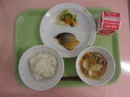 牛乳・ごはん・鯖のカレー焼き・野菜の中華風味・トックスープ