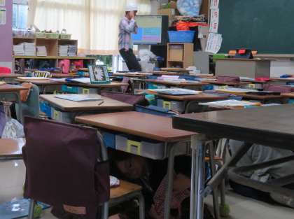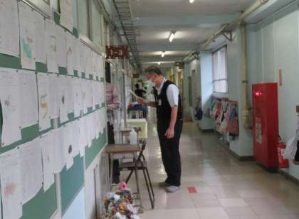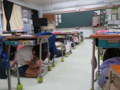 今日は11月の避難訓練で、放送機器が使えないことを想定しての訓練です。放送機器の代わりに学校主事や事務職員が大きな声で「訓練です。火事です。算数少人数教室から出火。避難してください。」と、廊下を走って知らせました。子どもたちは「お・か・し・も・ち」の約束を守り一人一人が真剣です。