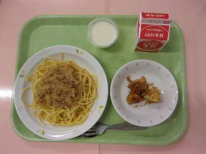 大根おろしスパゲッティー・おかかポテト・ヨーグルトぜりー・牛乳