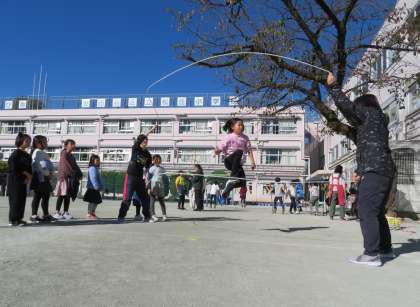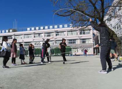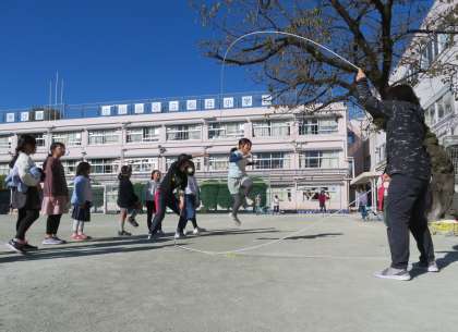 ダブルダッチに挑戦している子もいます。2本の縄が回っている中を跳んでいくので、1人でやる通常の縄跳びよりもむずかしいと思ってしまうかもしれません。しかし、コツさえつかめばダブルダッチのほうが運動が苦手な子どもでも愉しく縄跳び遊びに触れられるのです。