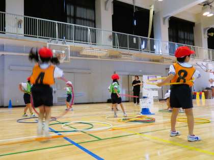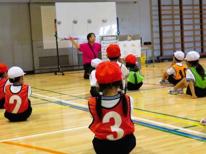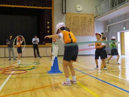 授業のめあては、「にんじゃのわざをふやそう」です。忍者ランドで、今まで学習した技から他の技に発展できないか(増やせないか)を考え取り組みました。