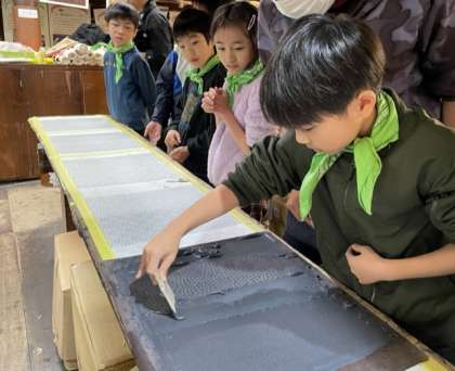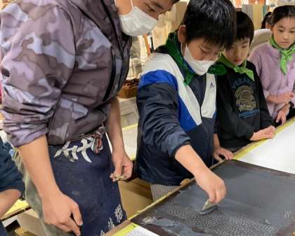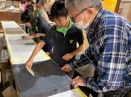 子どもたちは、いよいよ染付け体験です。白生地の上に伊勢型紙を乗せ、へらで防染糊を伸ばしていきます。