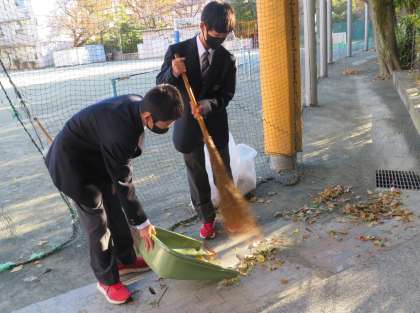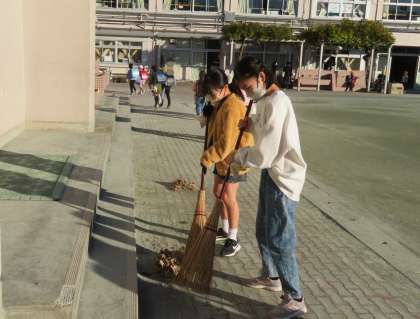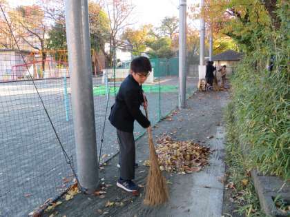 今日は「優郷の学び舎」落ち葉掃きです。弦巻中学校からはボランティアの生徒さんが、松小は自然委員会の皆さんが気持ちよく落ち葉掃きをしてくれました。
