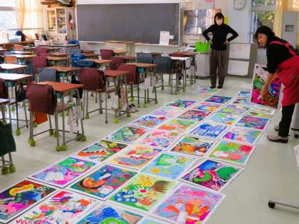 子どもたちの作品を、少しでもよくお見せすることができるようにと、作品の配置や装飾の一つ一つに工夫をしています。