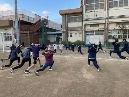 古川監督を中心にウォーミングアップで、体と心を温めています。