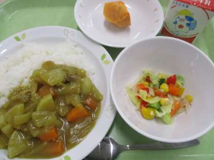 今日は「世田谷区育ちの大蔵大根」の日です。カレーライスに使用しました。大蔵大根は形に特徴があります。世田谷区で育った大蔵大根を美味しくいただきましょう。