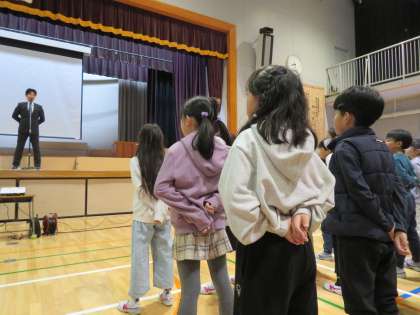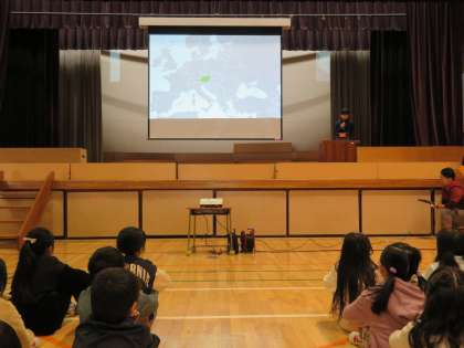 今日の3〜6年生の朝会は、世田谷区小学生海外派遣生として、5年生の児童が11月4日から11月11日まで、オーストリアのウィーン市等で文化や伝統に直接触れるとともに、現地の小学生と交流をしてきた報告会を行いました。
