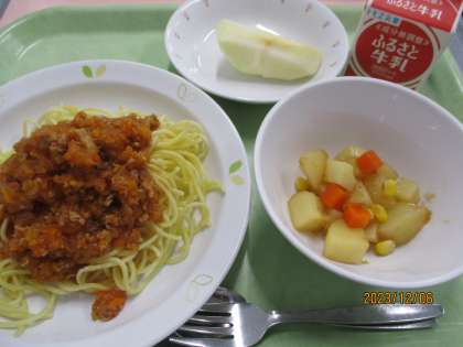 今日は「ミートソーススパゲティ」です。ひき肉・セロリー・玉ねぎ・人参・マッシュルーム・ニンニク・しょうがレンズ豆を使用しています。レンズ豆は扁平な形をしているので