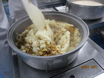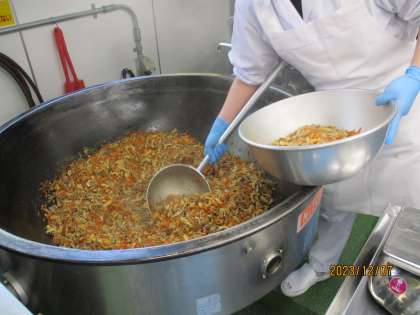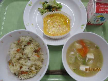 今日は「五目御飯」です。五目御飯のなかには、鶏肉・人参・ごぼう・しいたけ・こんにゃくが入っています。五種類の食材が入っていますね。