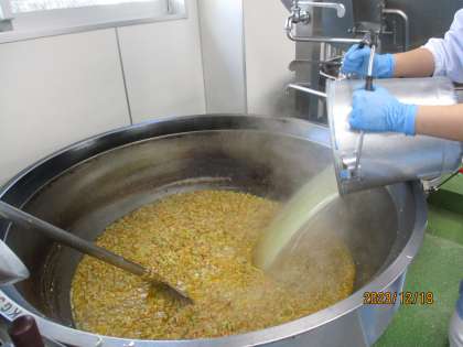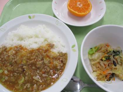 今日は「ジャージャー丼」です。豚ひき肉・ネギ・ニンニク・ショウガ・しいたけ・たけのこ・人参を全てみじん切りにして煮詰めて、食べやすくしています。