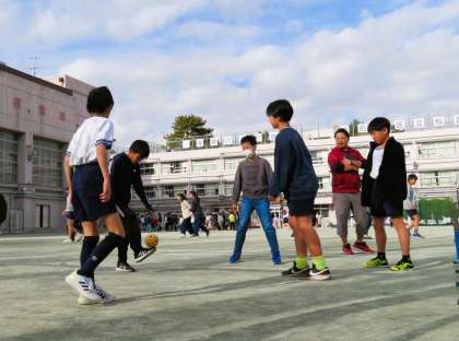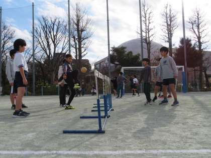 5年生は『セパタクロー』にチャレンジしています。「セパ」はマレー語で「蹴る」、「タクロー」はタイ語で「(籐で編んだ)ボール」と云う意味で、セパタクローは2つの言葉の合成語でです。ネットをはさんで足や腿または頭を使ってボールを相手コートに返しあう競技でバレーボールに似たゲームです。