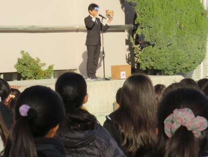 最後に、メジャーリーガーの大谷翔平選手から、3つのグローブのビックプレゼントが届いたことを話しました。子どもたちからは歓声と拍手が沸き起こりました。グローブの内側には大谷選手のサインが印字されています。添えられていた手紙には「私はこのグローブが、私たちの次の世代に夢を与え、勇気づけるためのシンボルとなることを望んでいます・・・」。手紙の締めくくりには「野球しようぜ」という、大谷選手の熱いメッセージが込められています。