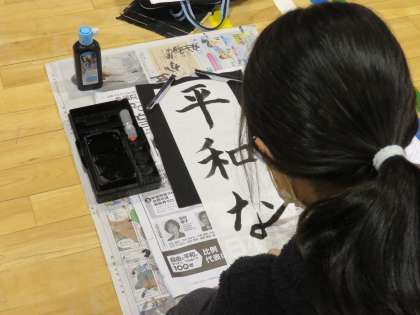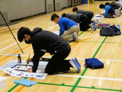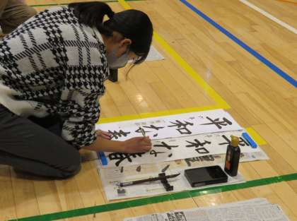 6年生席書会の様子です。体育館はピーンと張りつめた空気で、私語はありません。先生から話があり、書き初めがはじまりました。