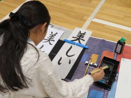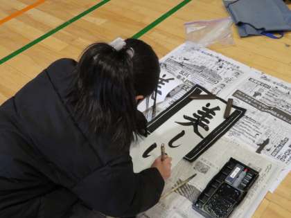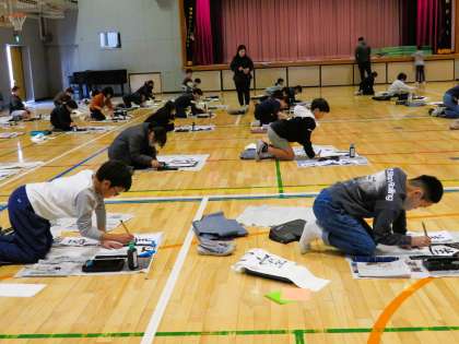 今日は4年生の席書会です。体育館でしっかりと心を落ち着け、一画一画ていねいに筆を進めていました。