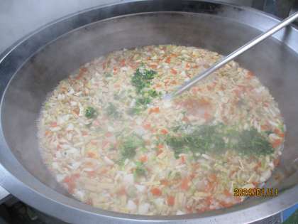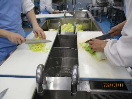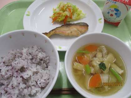今日は「七草汁」です。春の七草には7種類の野草があります。せり・なずな・ごぎょう・はこべら・ほこけのざ・すずな・すずしろです。年末年始で疲れた胃腸を優しく労わってくれる野菜です。1月7日にお粥の中に入れて食べたりします。今日は給食なので人参・大根・かぶ・かぶの葉などを使用してお汁にしました。