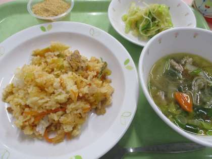 今日は「キムタクチャーハン」です。「キムチ」と「沢庵」を醤油・砂糖で味付けをして、ご飯に混ぜ込んでいます。キムチは少し辛いですが、沢庵が入っている事で食べやすくなっています。