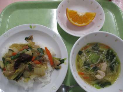 今日は「プルコギ丼」です。プルコギ丼は韓国料理です。通常は牛肉を使用することが多いですが、学校給食では豚肉や鶏肉を使用します。今日は豚肉を使用しています。