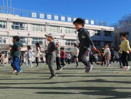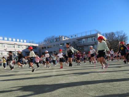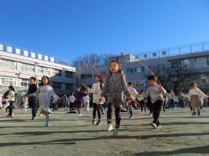 今日は2・4・5年生の短縄朝会2回目です。先生や5年生を手本に「リズム縄跳び」に取り組みました。基本的な前とび、後ろとび、駆け足とびなど、様々な跳び方を織り交ぜています。