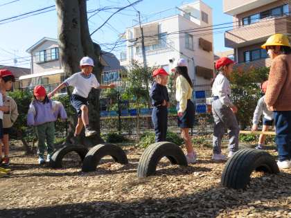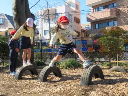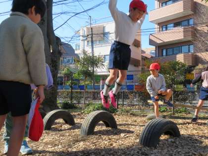 写真は、タイヤ跳びで遊んでいる1年生の様子です。