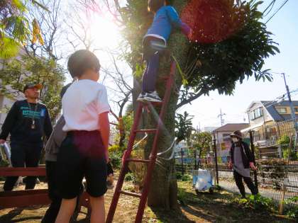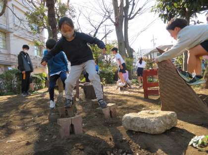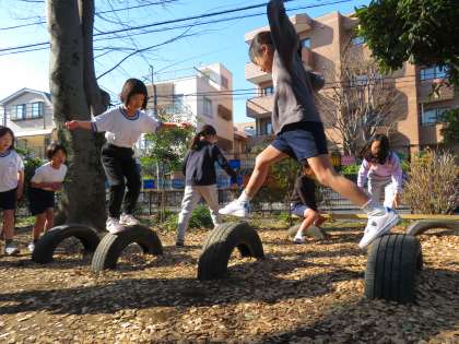 写真は、タイヤ、いわ跳び、木登りで遊んでいる1年生の様子です。