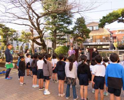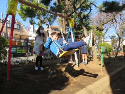 写真は、ブランコで遊び、6年生にお礼のあいさつをしている1年生の様子です。
