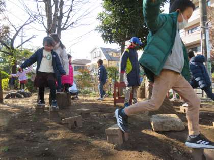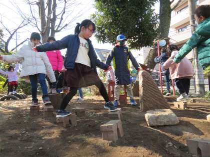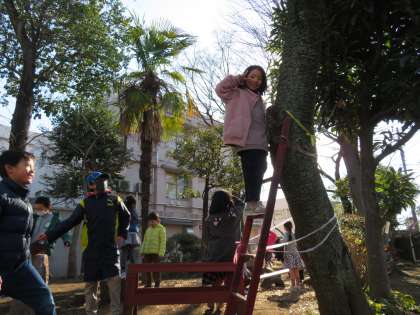 写真は、いわ跳び、木登りで遊んでいる1年生の様子です。