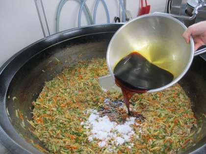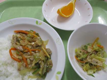 今日は「チンジャオロース丼」です。チンジャオロースとは豚肉と野菜の細切り炒めという意味です。ピーマン・たけのこ・玉ねぎ・人参・ねぎ・豚肉を使用しています。